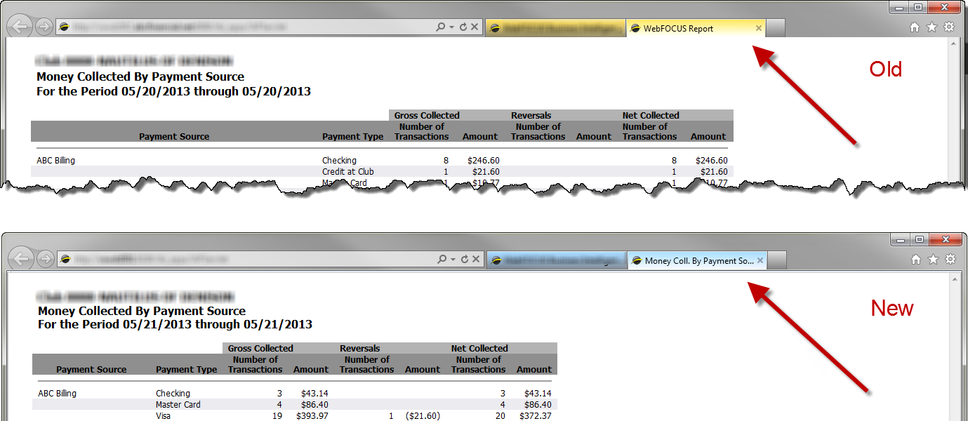 The report title did not appear in the web browser tab, Active Report tab, or the Excel tab sheet for the Money Collected by Payment Source and Money Collected by Payment Type reports. The issue has been corrected so that the appropriate report title appears.