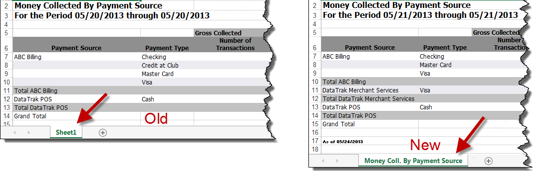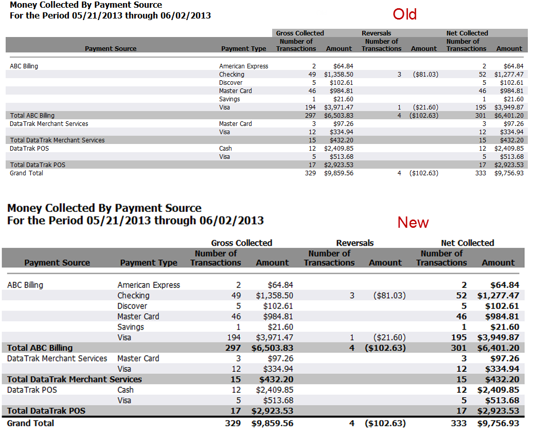 Styling on the Money Collected by Payment Type and Money Collected by Payment Source reports was changed so that subtotals and grand totals stand out from other data. The Money Collected by Payment Source report is shown below. Totals are now bold in both reports.
