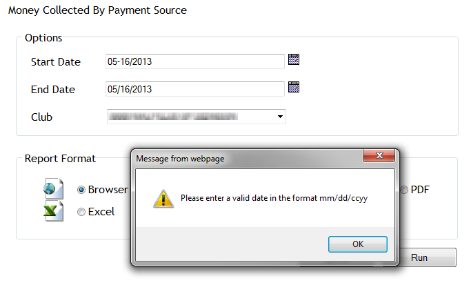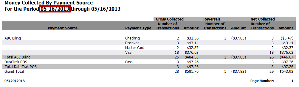 Sometimes the report header was incorrectly formatted due to the way Start Date or End Date were input on the parameters page when generating the Money Collected by Payment Source report. For example, if the user added a special character to the date on the parameters page such as 05-16/2013 (rather than the standard date format of 05/16/2013), the report header displayed the date as 05-16/2013 instead of 05/16/2013.