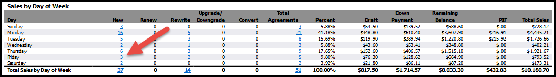 For example, in the Sales by Day of Week section select the total for New agreements sold on Friday.
