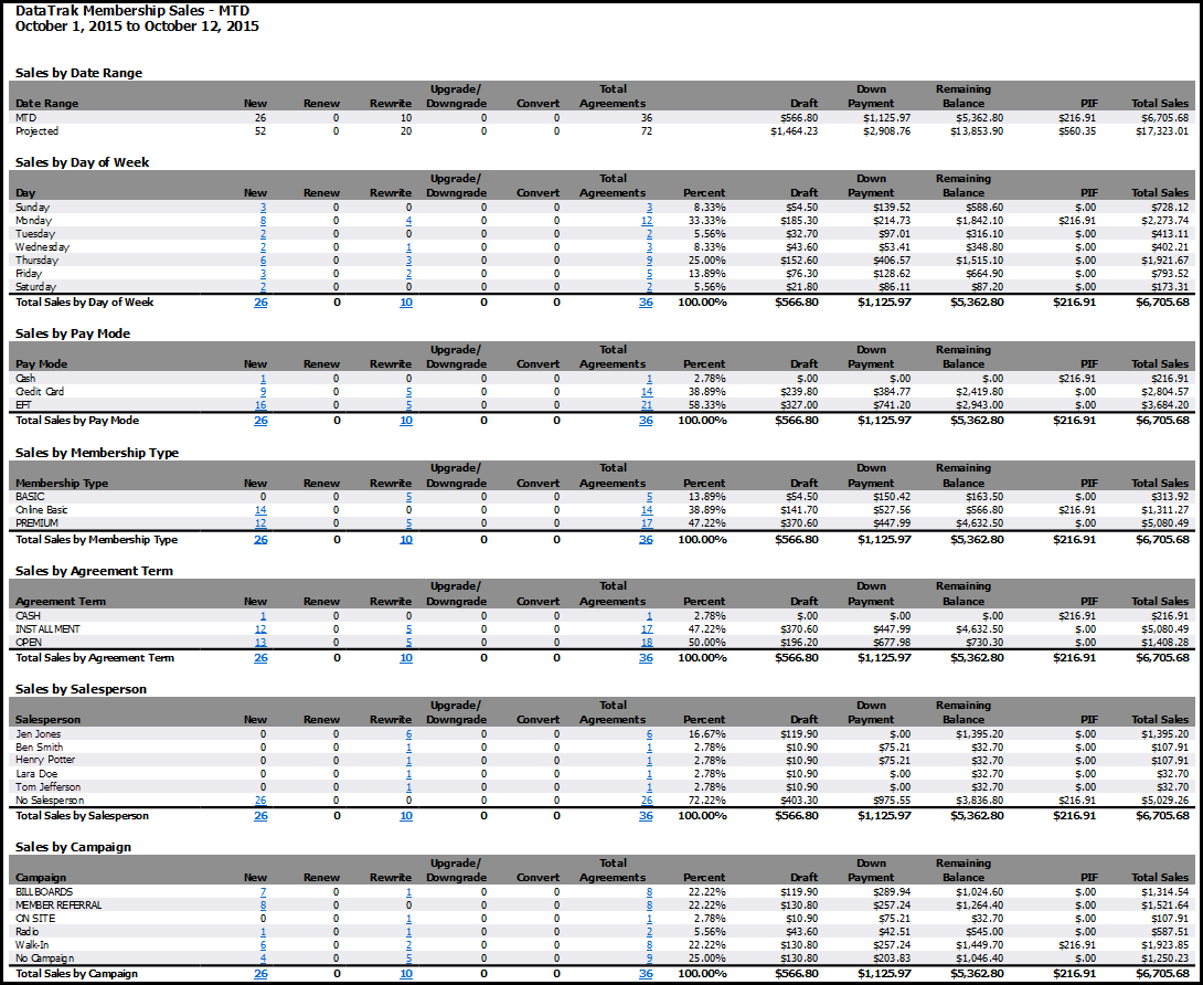 This report allows you to track DataTrak & Online Signup membership sales in real time so that you can monitor membership sales for the month across one or multiple clubs. You can also review membership sales for completed months. The report provides an overview of membership sales by date range, day of the week, pay mode, membership type, agreement type, salesperson, and campaign. Member-level detail reports are available to provide further information.