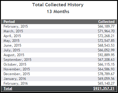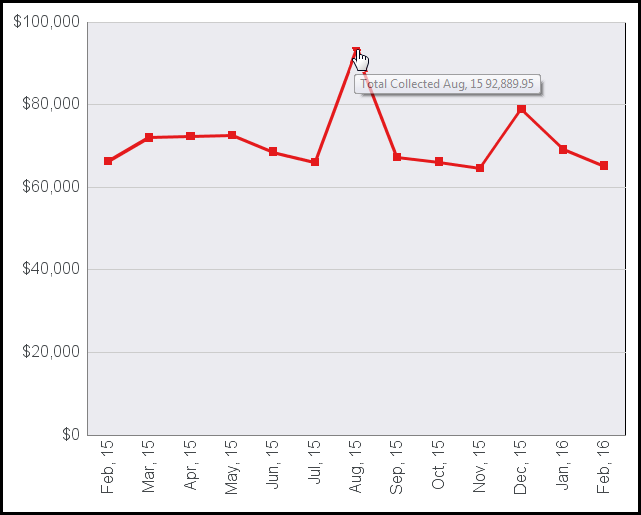 You can hover your mouse over any point along the graph to view the total collected for that month. To view all monthly collections for the period selected, click any point on the graph. This action generates a log of monthly collections for the period and the total collected across all months, as displayed below.
