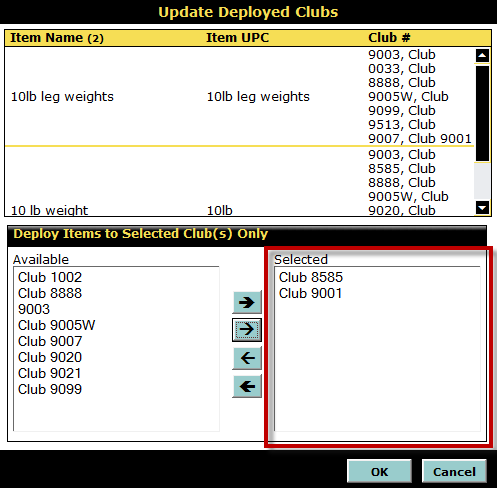 The Update Deployed Clubs dialog box will open. The top half of the dialog box lists the items you have selected and the clubs to which they have already been deployed, if any. - Move the clubs to which you want to deploy these items to the Selected list.