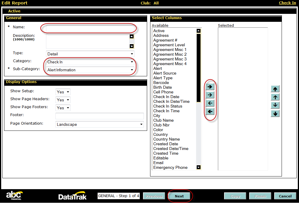 - For the club filter, move the clubs you want to display on the report from Available to Selected using the multi-select list (see Multi-Select List).