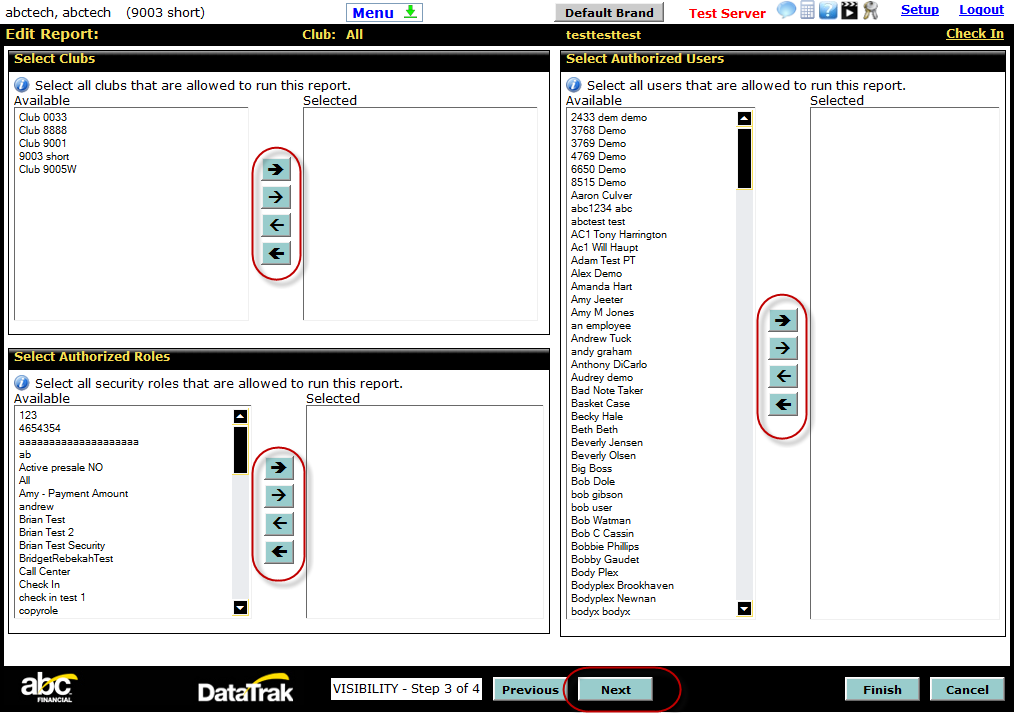 - Select the users who should be allowed to run the report. If no user is selected, the report will not be restricted by user.