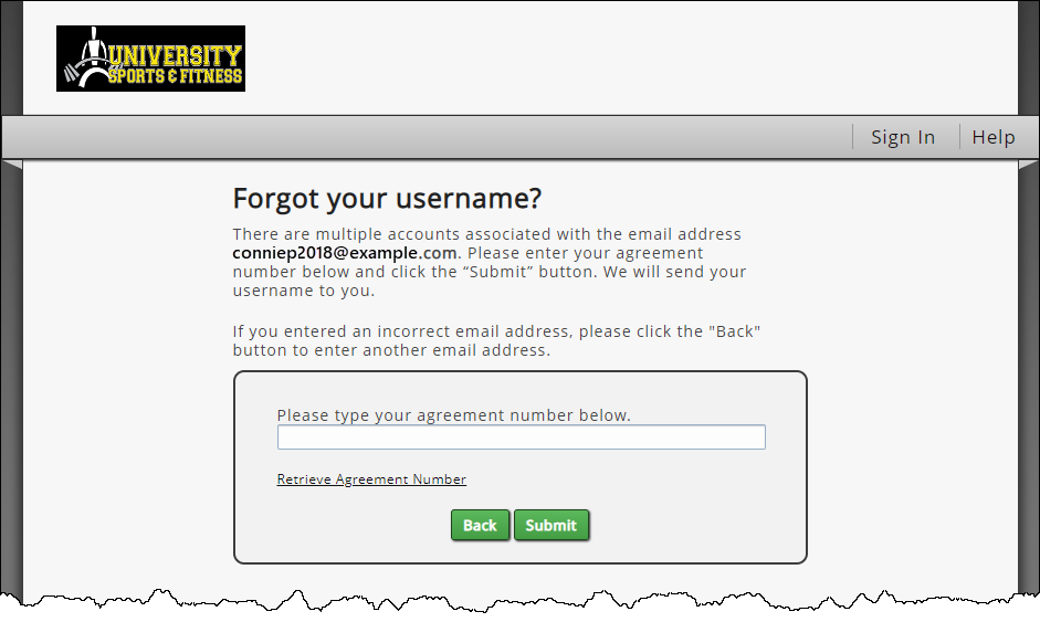 However, now the system will indicate if multiple agreement numbers are associated with the supplied email address (the email address is displayed in bold type), and those members will be prompted to enter an agreement number. If the wrong email address was entered, the member can click Back to enter a different one.