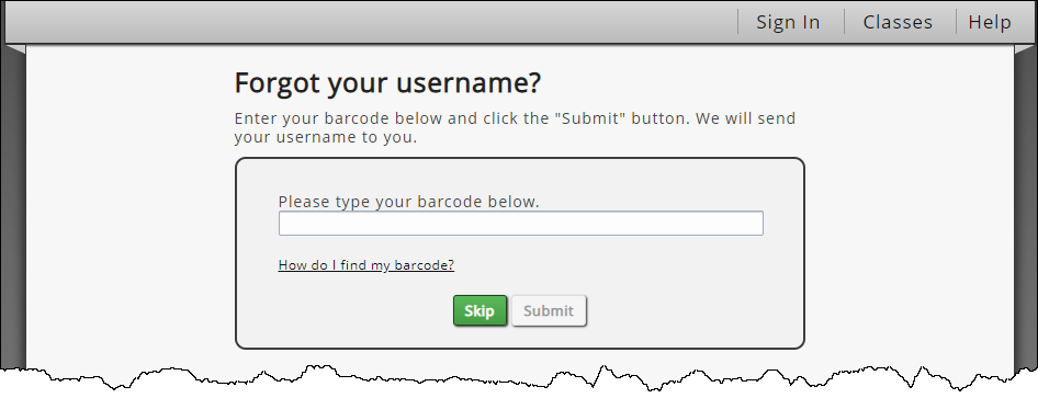 If the member with multiple agreements does not know the specific agreement number for which they wish to find the username, they can click the Retrieve Agreement Number link. The member will be prompted to enter their barcode to find the agreement number, or click Skip to have all agreement numbers sent to the email address provided.
