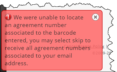 If the barcode that was entered does not have an agreement number associated with it, the following error message is displayed: We were unable to locate an agreement number associated to the barcode entered, you may skip to receive all agreement numbers associated to your email address