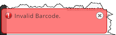 If the barcode entered is not found or is invalid, the following error message is displayed: Invalid Barcode
