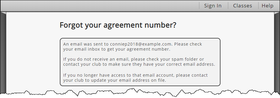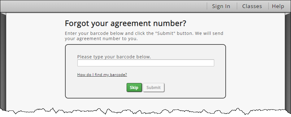 If the member cannot find their barcode, they can click Skip to have the system send an email message with the agreement number. An example of the skip barcode confirmation page is shown below.