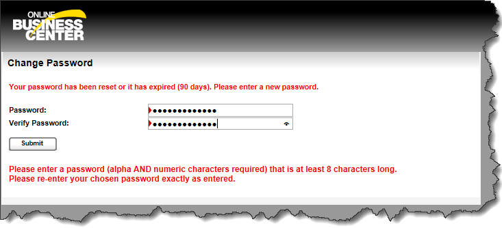 - Type a new password in the Password field. Your password must be at least eight (8) characters in length and contain both letters (A-Z) and numbers (0-9).